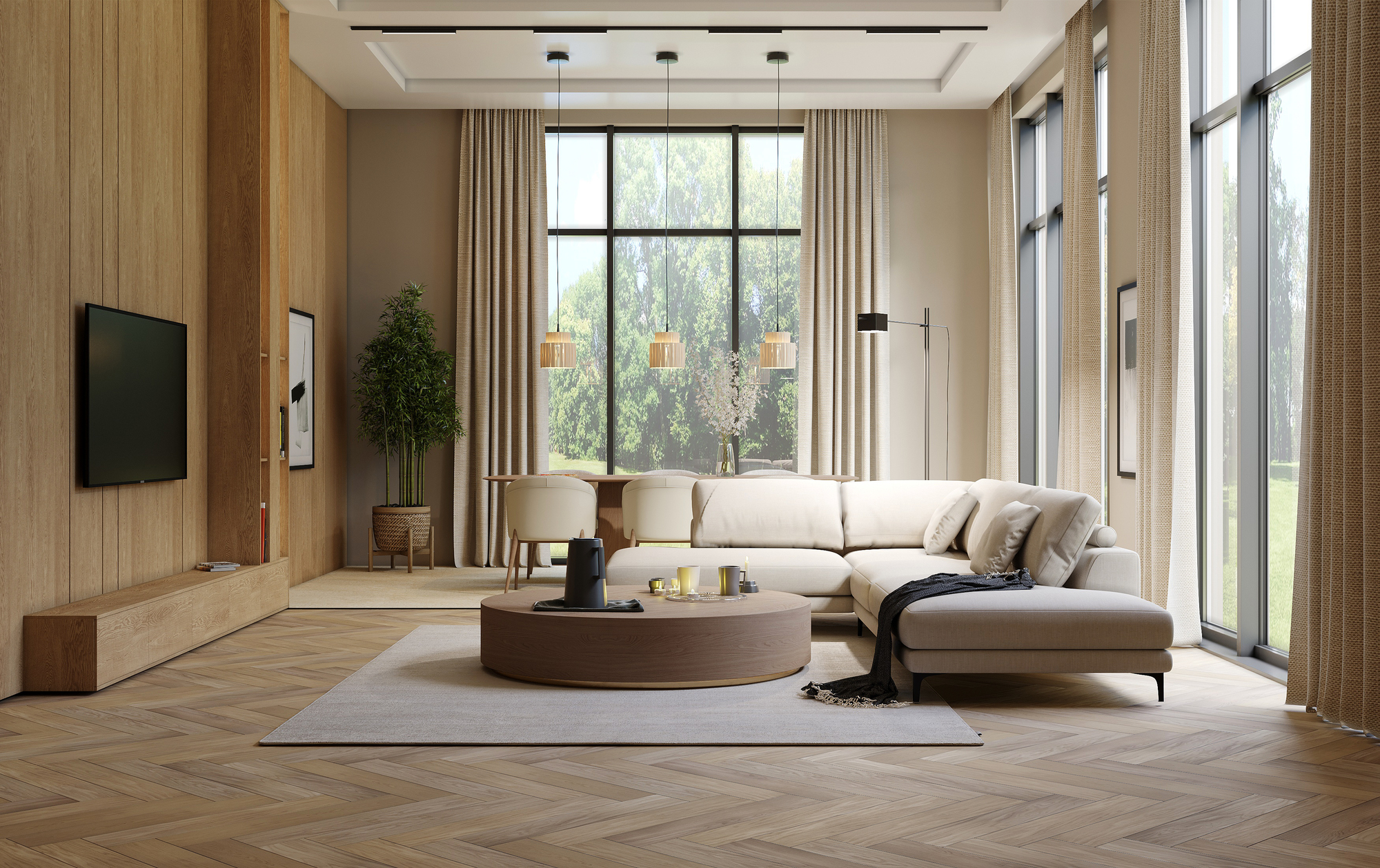 Такой дизайн гостиной идеально подойдёт для ценителей современного стиля: он гармонично объединяет натуральные материалы, нейтральную палитру и продуманное зонирование. Благодаря этому гостиная остаётся не только красивой, но и максимально практичной — пространство работает на комфорт каждого члена семьи.