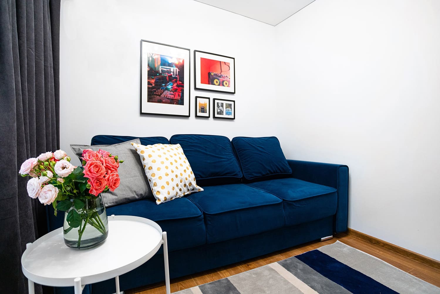 Синие акцентные элементы — диван и мягкое изголовье кровати — придают интерьеру насыщенность, а компактная мебель и продуманные зоны хранения повышают практичность объекта. Такое оформление идеально подходит для краткосрочной и долгосрочной аренды, привлекает гостей современным стилем и позволяет владельцу оставаться в топе предложений на рынке недвижимости.